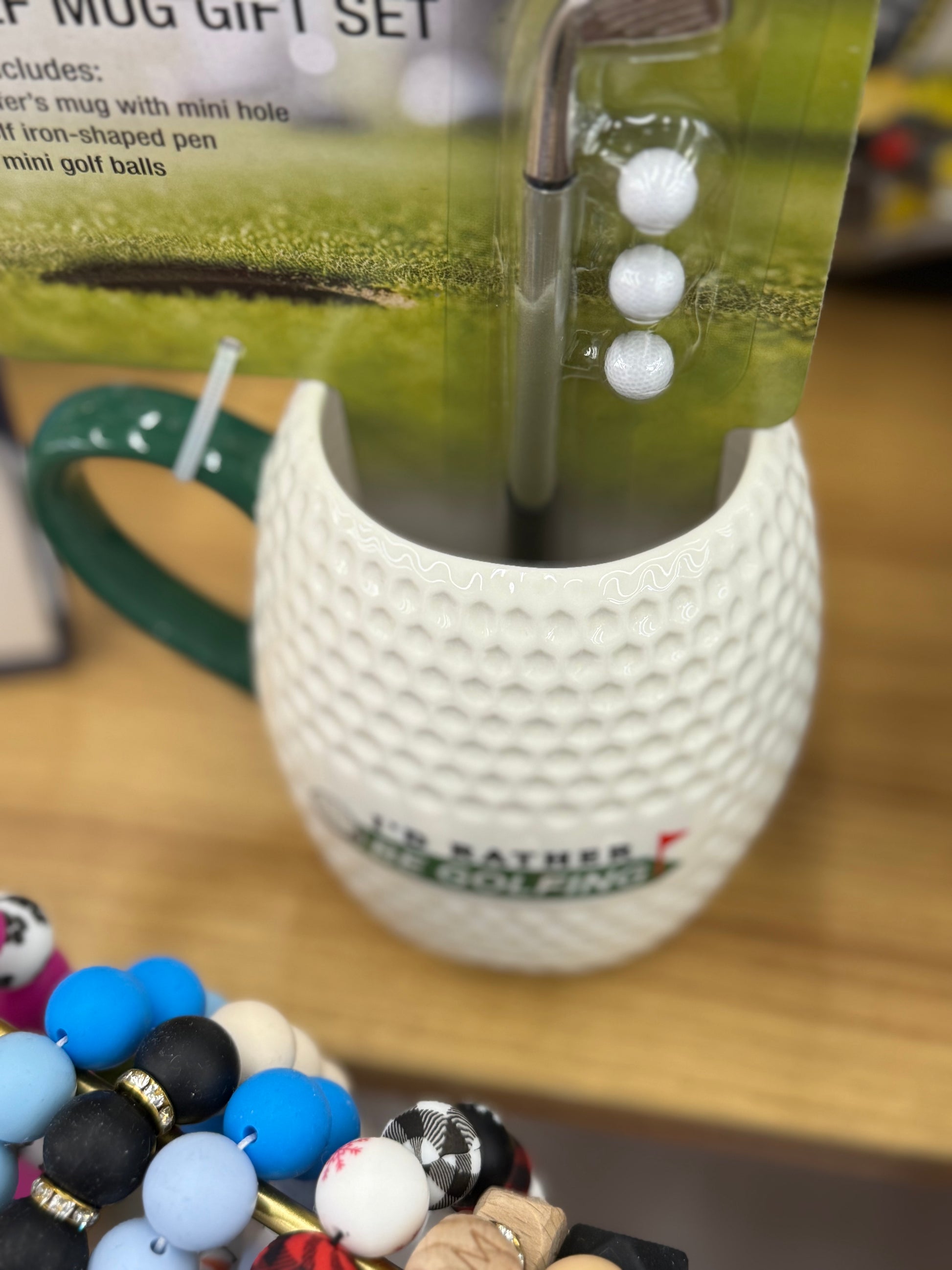 This Golf Gift Set includes a 16oz ceramic mug with coordinating putter-shaped pen and 3 golf balls. An excellent present for golfers! When bored you can put the balls under the mug! How cute is that?!