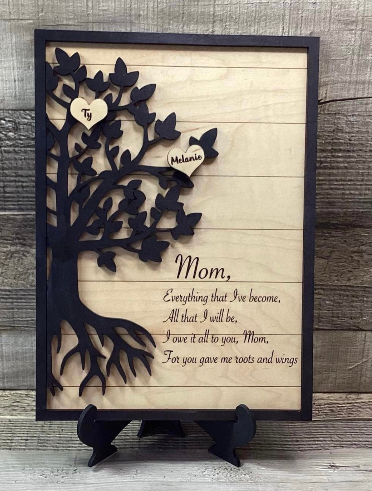 Laser cut and engraved Mother's day plaque. Family tree personalized sign with kids or grand kids names in hearts hanging on the leaves. Unique design.