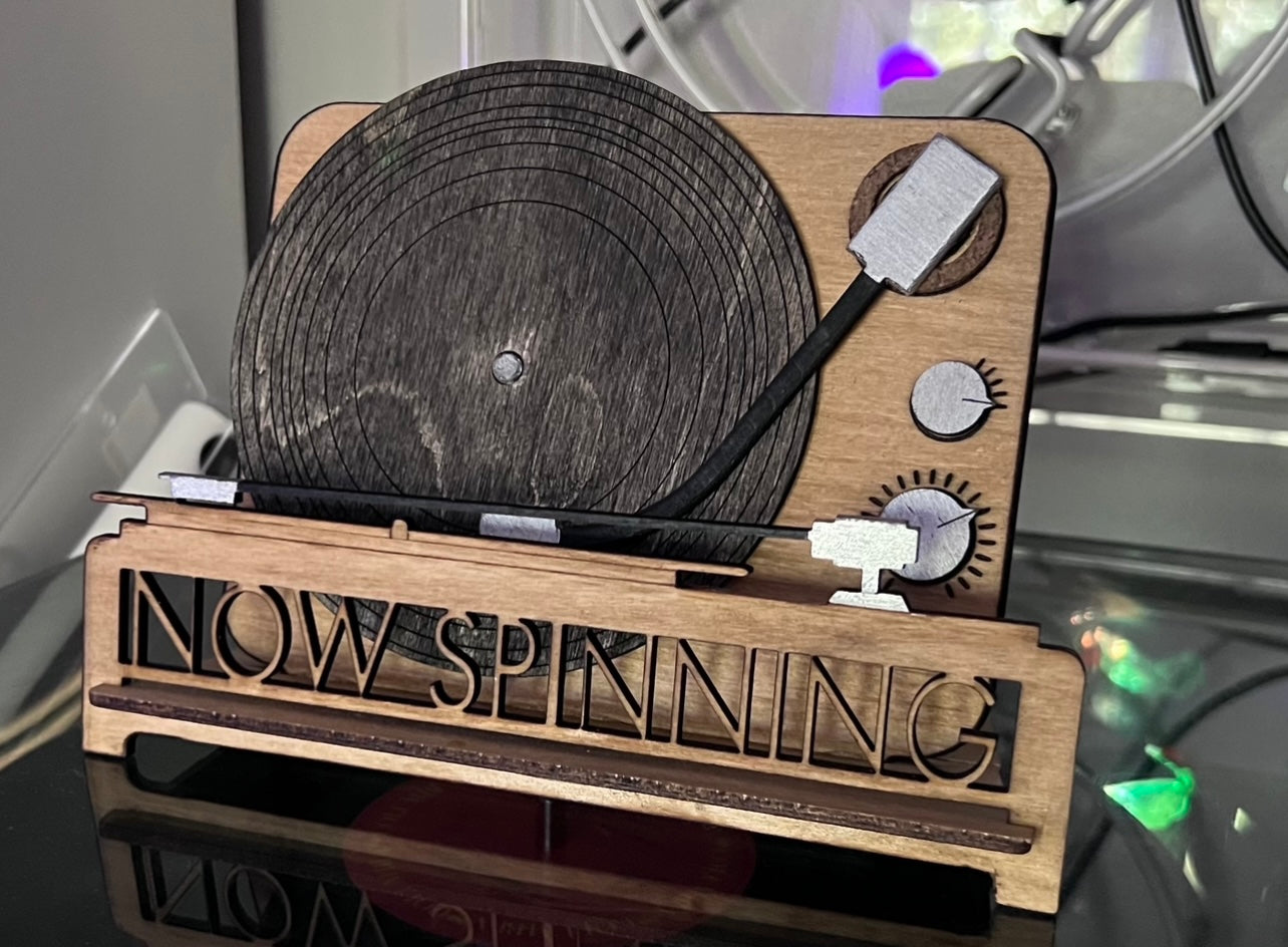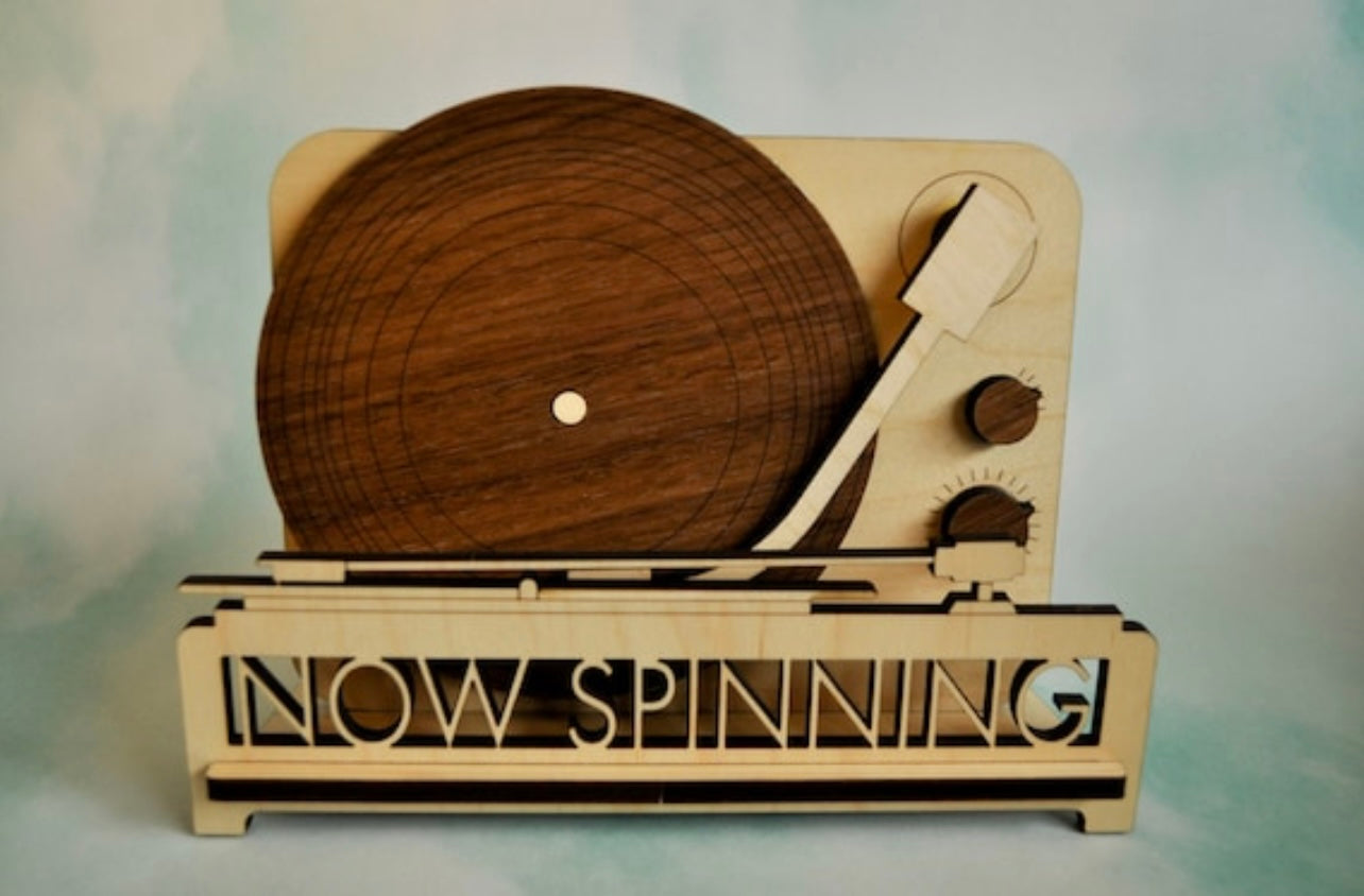"Now Spinning" record player album display stand. Provides a decorative solution to displaying the sleeve of your currently playing or favorite album. Made of 1/4” birch finished plywood.
